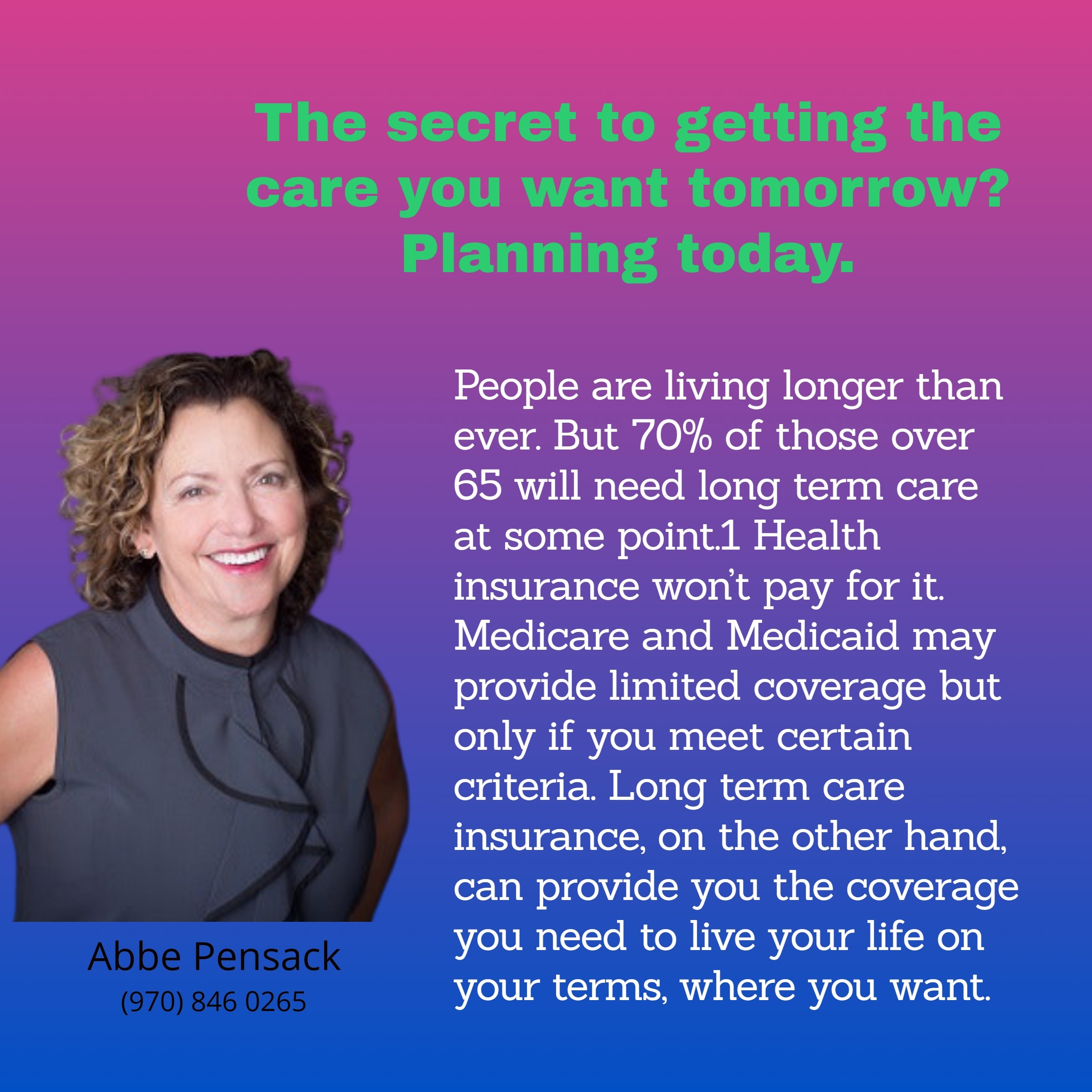 People are living longer than ever. But 70% of those over 65 will need long term care at some point.1 Health insurance won’t pay for it. Medicare and Medicaid may provide limited coverage but only if you meet certain criteria. Long term care insurance, on the other hand, can provide you the coverage you need to live your life on your terms, where you want.